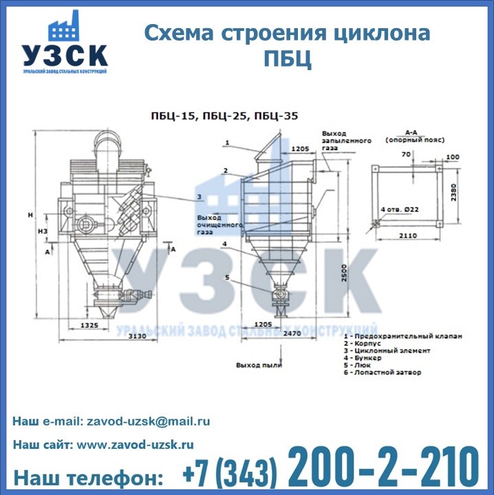 Завод «УЗСК» в Нефтекамске предлагает приобрести циклоны ПБЦ и прочие устройства, полностью укомплектованные и готовые к эксплуатации. Мы гарантируем соответствие оборудования всем требованиям ГОСТ и ТУ, износостойкость и высокую производительность предлагаемого оборудования. Уральский Завод Стальных Конструкций изготавливает и продает надежное, эффективное и производительное оборудование, имеющее длительную гарантию и большой эксплуатационный ресурс. Если требуется изготовить циклон нестандартных размеров, то такой вариант выполнения заказа тоже предусмотрен, так как предприятие имеет собственные производственные площади и надежных поставщиков. На все поставляемое или производимое оборудование имеются чертежи и прочая техническая документация. Заказать и купить циклоны или прочее оборудование высокого качества и по доступной цене можно через наш сайт или по указанному в разделе «Контакты» телефону.
