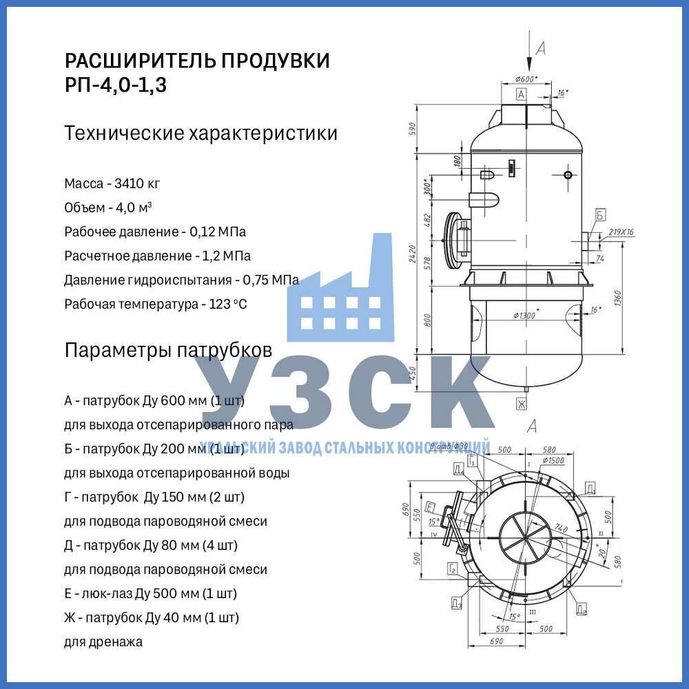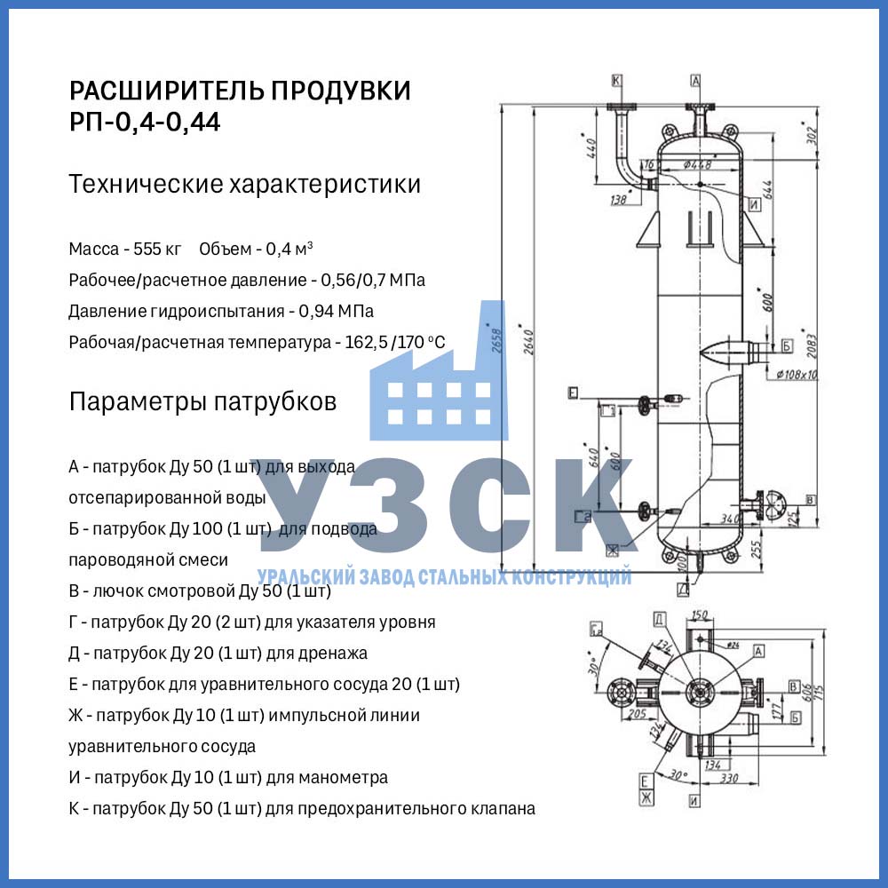 Конструктивно расширитель продувки (РП) — это вертикальный цилиндрический сосуд, изготавливаемый из стальной обечайки с эллиптическими днищами. Стандартная комплектация включает:
